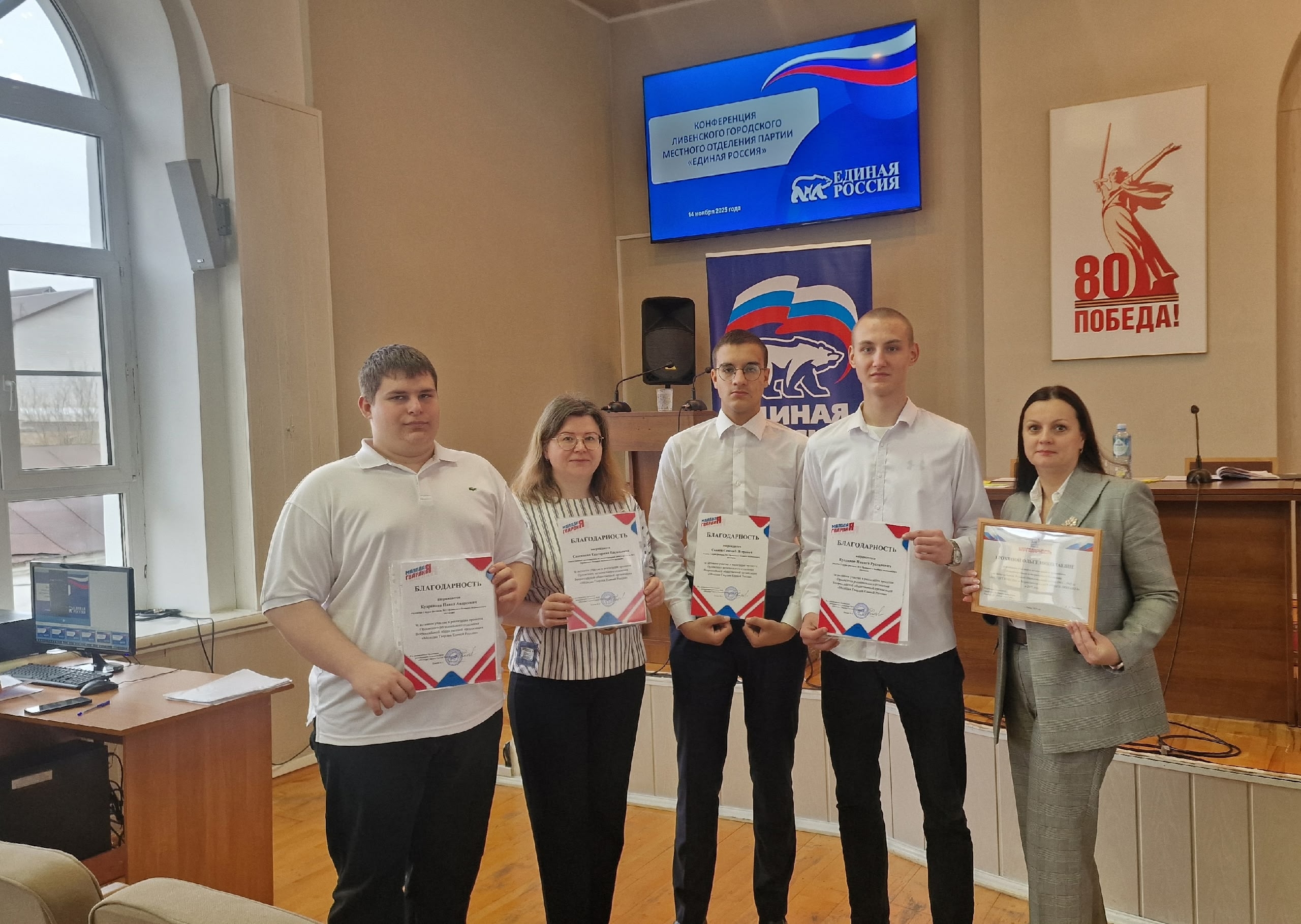 За активное участие в мероприятиях Молодой Гвардии благодарности получили активисты колледжа Булдаков Н., Кудрявцев П., Савков С. и ответственный преподаватель по воспитательной работе Савенкова Е. В.