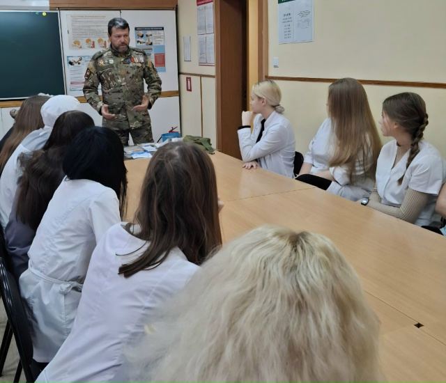 Атаман Орловского представительства Общероссийской общественной организации по развитию казачества "Союза Казаков - Воинов России и Зарубежья", ветеран СВО есаул А .В. Басенков продемонстрировал будущим медикам основные приёмы остановки кровотечений в условиях специальной военной операции.